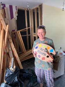 Another chunk of the funding (£3600) had been set aside for rent, insurance, wifi and utilities. Partly because the building required such extensive repairs, and partly because of his generosity, the landlord, John Peters, allowed us a rent free period until January 2022. We used the funding to pay for the electric (once we finally got the electrics made safe and turned on!) and public liability insurance. After cleaning the building with the support of many volunteers of five years of rubbish and part building works left by the old tenants, we then began a long period of refurbishment in lieu of rent, again using volunteers where possible not just to keep costs down, but also to include as many local people as possible. We did pay some professional contractors whose skills we needed – S Trott Electrical Services, local builder Matt Renshaw and Theo Sykes who has helped us with plumbing. We replastered severely damaged walls and repaired a ceiling that had fallen down. We had a new disabled toilet and sink installed, and installed a small kitchen area.